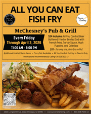 All You Can Eat Fish Fry in McChesney’s Pub & Grill on Friday, February 20, 2026 through Friday, April 3, 2026. Reservations Recommended by Call 630.208.7600 x3.